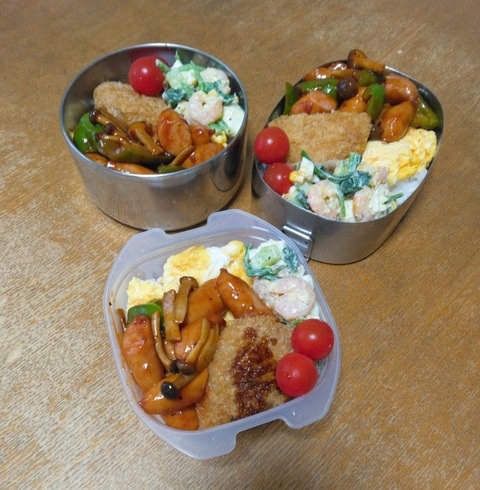 夫は「豚こま肉で焼き肉弁当」私は「作り置き・冷凍食品弁当」