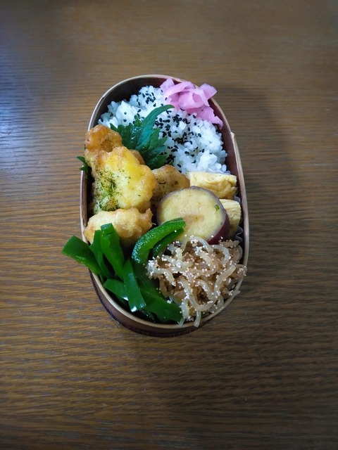 ほたてとたけのこの炊き込みご飯とサーモンフライ