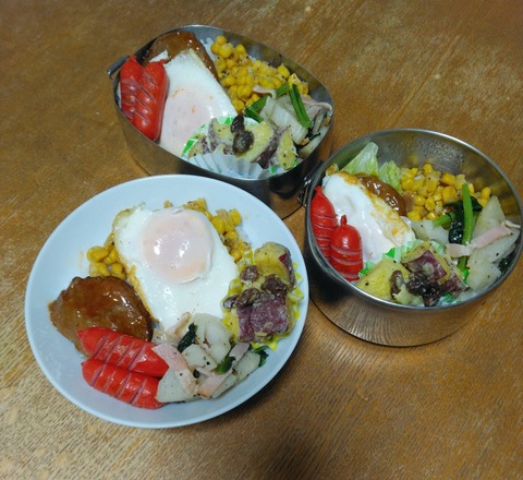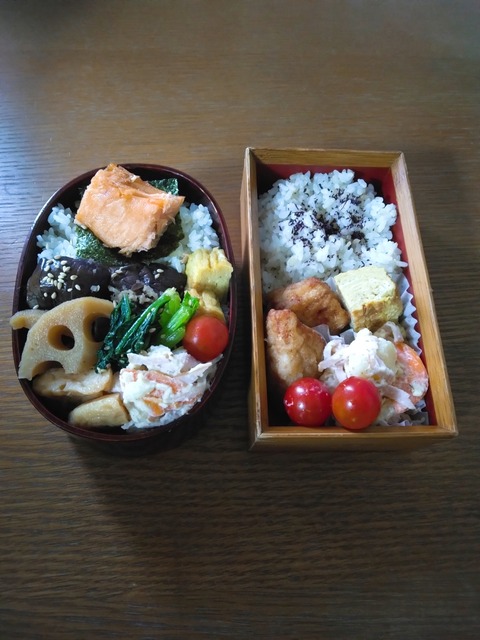 おはようございます☆やっと陽が出てきた☀*今日のメニュー・ハンバーグ(イシイのチキンハンバーグ)・赤いウインナーソテー・めだま焼き・れんこんとベ···