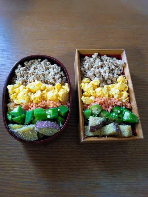 おはようございます⭐心なしか、今日は少し暑さがやさしい?*今日のメニュー・鶏そぼろ・白だし炒りたまご・おくらお浸し・おさつ甘煮のごま和え・鮭···