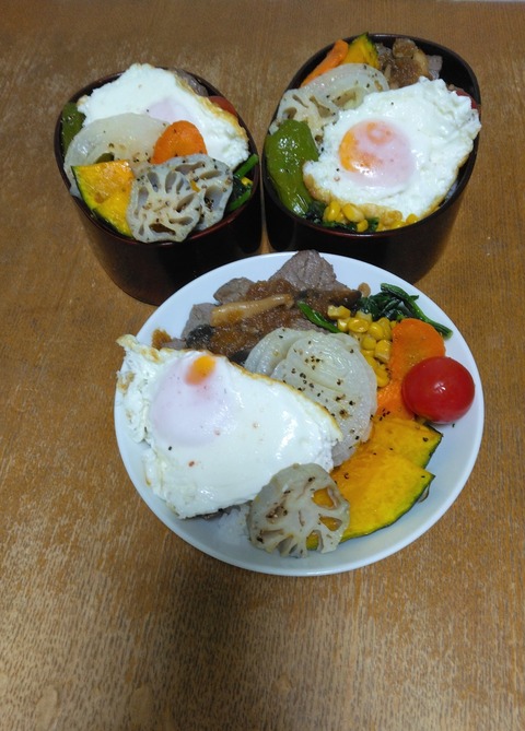 おはようございます☆今日もそこまでの寒さじゃないな。*今日のメニュー・牛ももステーキ(ステーキ宮のソース)・めだま焼き・野菜ロースト かぼちゃ···