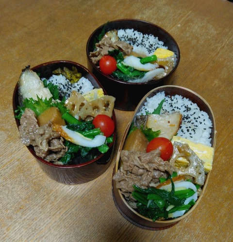 おはようございます☆寒い雨降り~?*今日のメニュー・サワラの西京焼き・牛肉と里いもの甘辛煮・ねぎとしらすのだし巻き・れんこんきんぴら・小松菜と···
