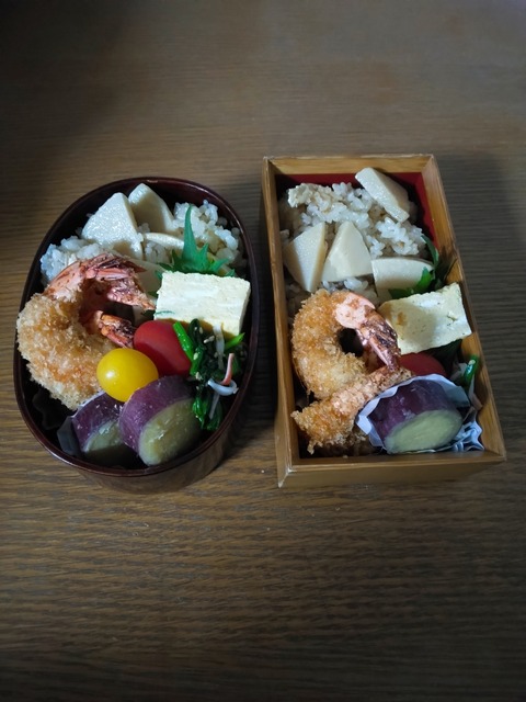 おはようございます⭐また雨…。*今日のメニュー・エビフライ・ねぎ入りだし巻き・おさつのバターしょうゆ煮・ほうれん草とカニかまのお浸し・たけのこ···