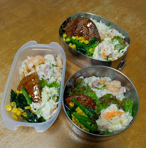 おはようございます☆雨降りで湿気たっぷり…?*今日のメニュー・レトルトハンバーグ・ほうれん草とコーンの炒め物・ポテトサラダ・混ぜるエビピラフ家···