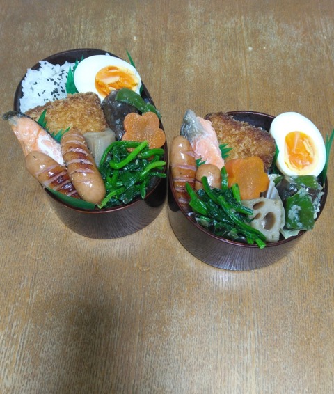 おはようございます☆なんだか少し暖かい?*今日のメニュー・鮭・エビカツ(お惣菜)・味たま・ウインナーソテー・れんこんとミニがんもの煮物・茄子と···