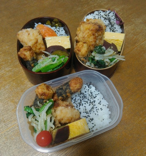 おはようございます☆清々しいけど、ちょっと暑い…*今日のメニュー・塩麴から揚げ(お惣菜)・海苔巻きチキン(お惣菜)・だし巻き・おさつの甘煮・小松菜···