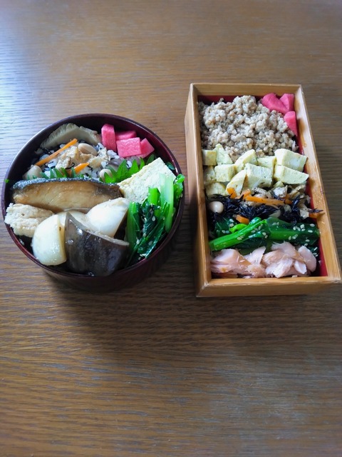 う巻きと鮭西京焼きとひじきと枝豆のまぜずし