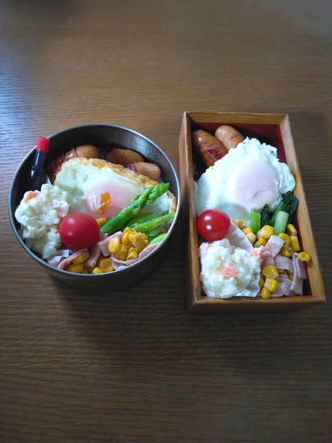 夫は「豚こま肉で焼き肉弁当」私は「作り置き・冷凍食品弁当」