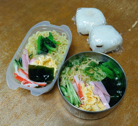 夫は「豚こま肉で焼き肉弁当」私は「作り置き・冷凍食品弁当」