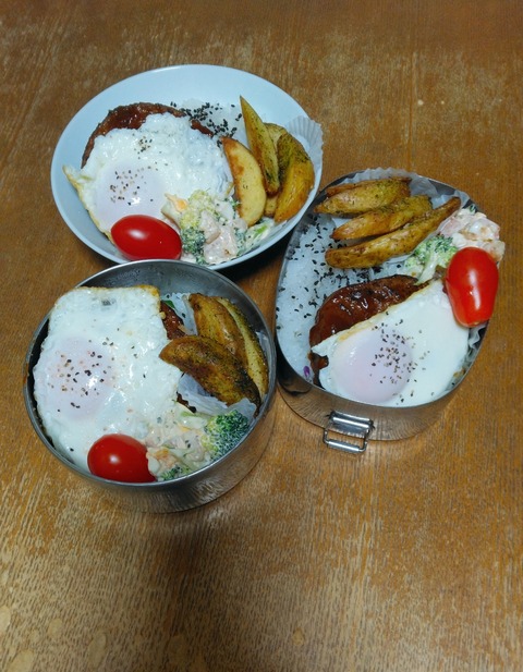 おはようございます☆暖かめな今日この頃。*今日のメニュー・ハンバーグ(レトルト)・めだま焼き・ブロッコリーとエビのタルタルサラダ・海苔塩ポテト···