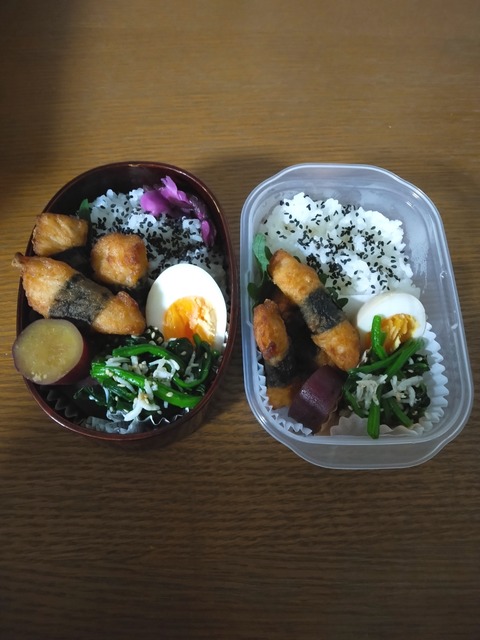 おはようございます☆今日も夏みたい☀*今日のメニュー・肉詰めピーマン・だし巻き・大学いも・小松菜ともやしとお揚げのお浸し・たけのこごはんバタバ···