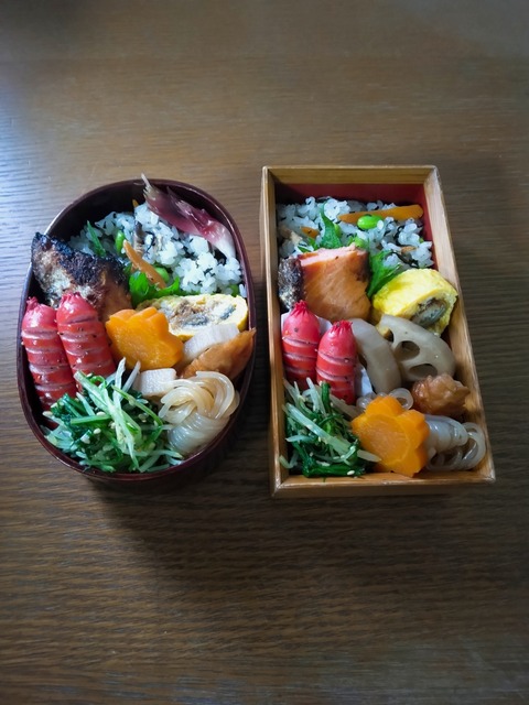 う巻きと鮭西京焼きとひじきと枝豆のまぜずし